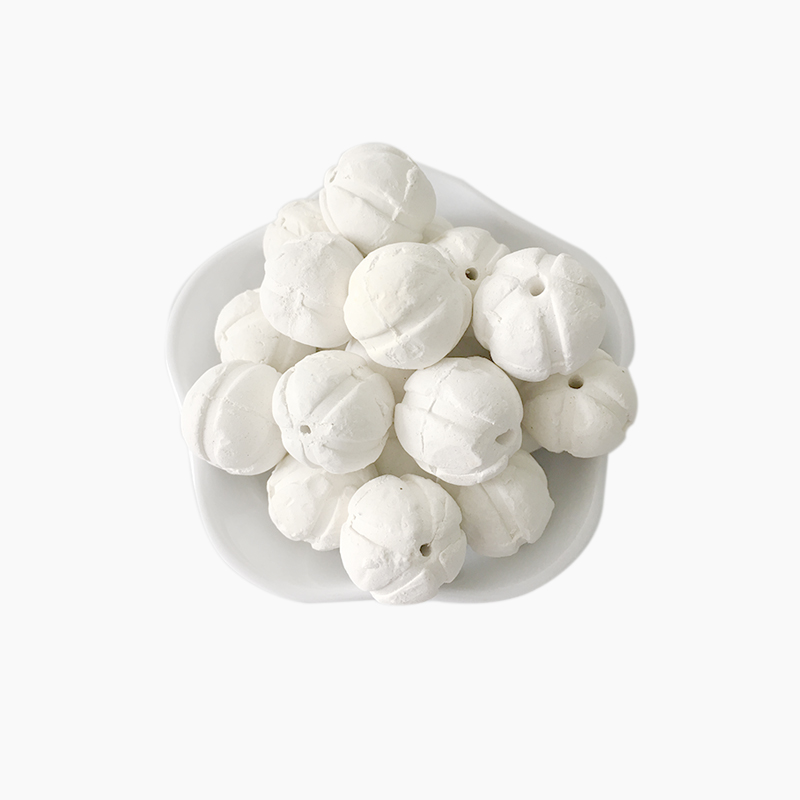 開孔瓷球外觀為白色球體,開孔互相垂直,開孔數量可以根據實際使用需要和瓷球的尺寸大小開單孔、三孔、五孔及七孔。
