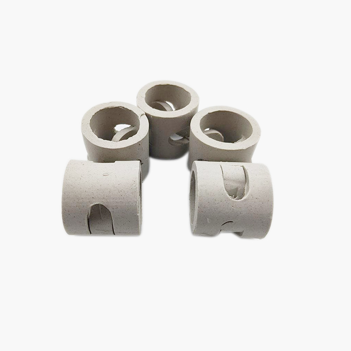 陶瓷鮑爾環(huán)填料是在陶瓷拉西環(huán)的基礎上開發(fā)的一種高徑相等的開孔環(huán)型填料,每層窗孔有5個舌葉,每個舌葉內彎指向環(huán)心,上下兩層窗孔的位置相反錯開,一般開孔面積約占環(huán)壁總面積的30%左右,使得填料塔內的氣體和液體能夠從窗孔自由通過,改善了氣液分布,充分利用了環(huán)的內表面。