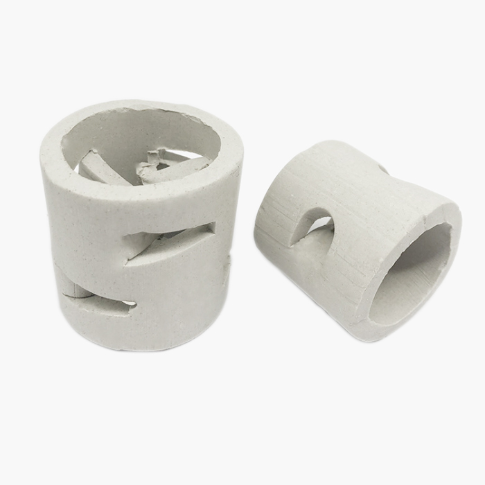 陶瓷鮑爾環(huán)填料是在陶瓷拉西環(huán)的基礎(chǔ)上開發(fā)的一種高徑相等的開孔環(huán)型填料,每層窗孔有5個(gè)舌葉,每個(gè)舌葉內(nèi)彎指向環(huán)心,上下兩層窗孔的位置相反錯(cuò)開,一般開孔面積約占環(huán)壁總面積的30%左右,使得填料塔內(nèi)的氣體和液體能夠從窗孔自由通過,改善了氣液分布,充分利用了環(huán)的內(nèi)表面。