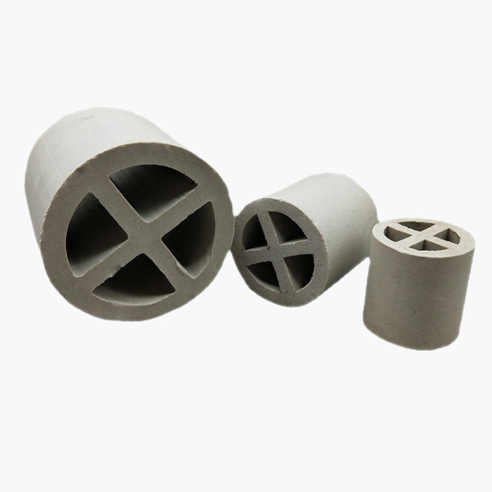 陶瓷十字隔板環(huán)填料是基于增加填料的比表面積,從而強化傳質(zhì)效率而開發(fā)出來的。 其形狀是在拉西環(huán)中間增設(shè)了十字隔板。 一般來講,這種填料由于尺寸較大,僅適用于整體堆徹,目前一般只作為亂堆填料的塔底支撐分布層用。